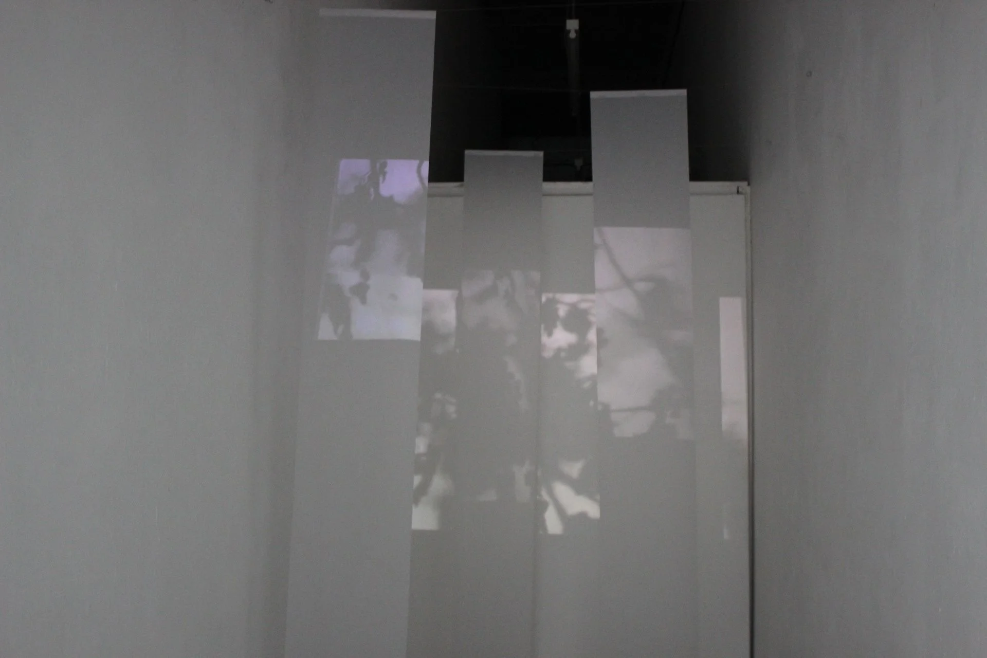 Rather than presenting images as representation, the works treated light as spatial substance. Translucent fabric, darkness, distance, and vertical framing were used to dissolve the boundary between image and structure. Each installation functioned as a distinct spatial condition, yet together they formed a progression: from suspension, to passage, to ritual architecture.